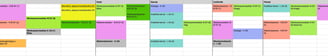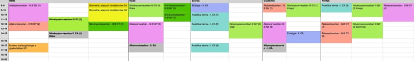 1. Ha a tárgyfelvétel megnyitása előtt be vannak írva az órarendi adatok, akkor még tárgyfelvetel előtt írd össze az órarendet a fix órákkal, és tervezd meg, hogy melyik gyakorlatokra szeretnél jelentkezni. A lenti képen látható egy régebbi ilyen tervem. Én Excelben szoktam csinálni az órarendem. Minden naphoz több oszlop tartozik, így a párhuzamosan folyó órák is elférnek. Minden órát más színnel jelölhetsz. Azokat a kötelező órákat, amelyekből csak egy időpont van, jelölheted szürkével, mert azoknak fix az időpontja. A gyakorlatoknál jelöld a csoport számát is, ez fontos lesz majd a tárgyfelvételnél.